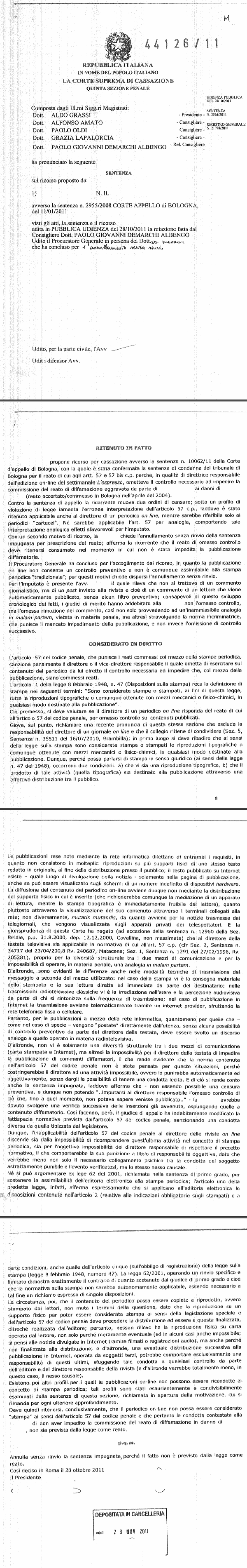 dichiara la manifesta inammissibilità della questione di legittimità costituzionale dell’articolo 11 della legge 8 febbraio 1948, n. 47 (Disposizioni sulla stampa), «nella parte in cui esclude dalla responsabilità civile ivi prevista il proprietario ed editore del sito web, sul quale vengono diffusi giornali telematici», sollevata, in riferimento all’articolo 3, primo comma, della Costituzione, dal Tribunale di Alessandria, in composizione monocratica, con l’ordinanza indicata in epigrafe. Così deciso in Roma, nella sede della Corte costituzionale, Palazzo della Consulta, il 12 dicembre 2011. F.to: Alfonso QUARANTA, Presidente Alessandro CRISCUOLO, Redattore Gabriella MELATTI, Cancelliere Depositata in Cancelleria il 16 dicembre 2011. Il Direttore della Cancelleria F.to: MELATTI Social network senza obblighi di vigilanza sui file pirata: la Corte Ue boccia l'imposizione di filtri ai gestori delle retiSENTENZA DELLA CORTE (Terza Sezione) 16 febbraio 2012 (*) «Società dell’informazione – Diritto di autore – Internet – Prestatore di servizi di hosting – Trattamento delle informazioni memorizzate su una piattaforma di rete sociale in linea – Predisposizione di un sistema di filtraggio di tali informazioni al fine di impedire la messa a disposizione di file che ledono i diritti d’autore – Assenza di un obbligo generale di sorvegliare le informazioni memorizzate» Nella causa C-360/10, avente ad oggetto la domanda di pronuncia pregiudiziale proposta alla Corte, ai sensi dell’articolo 267 TFUE, dal presidente del rechtbank van eerste aanleg te Brussel (Belgio), con decisione del 28 giugno 2010, pervenuta in cancelleria il 19 luglio 2010, nel procedimento Belgische Vereniging van Auteurs, Componisten en Uitgevers CVBA (SABAM) contro Netlog NV, LA CORTE (Terza Sezione), composta dal sig. K. Lenaerts, presidente di sezione, dal sig. J. Malenovský (relatore), dalla sig.ra R. Silva de Lapuerta, dai sigg. G. Arestis e D. Šváby, giudici, avvocato generale: sig. P. Cruz Villalón cancelliere: sig.ra M. Ferreira, amministratore principale vista la fase scritta del procedimento e in seguito all’udienza del 7 luglio 2011, considerate le osservazioni presentate: – per la Belgische Vereniging van Auteurs, Componisten en Uitgevers CVBA (SABAM), da B. Michaux, F. de Visscher e F. Brison, advocaten; – per la Netlog NV, da P. Van Eecke, advocaat; – per il governo belga, da T. Materne e J.-C. Halleux, in qualità di agenti; – per il governo italiano, da G. Palmieri, in qualità di agente, assistita da S. Fiorentino, avvocato dello Stato; – per il governo dei Paesi Bassi, da C. Wissels, in qualità di agente; – per il governo del Regno Unito, da S. Ossowski, in qualità di agente; – per la Commissione europea, da A. Nijenhuis e J. Samnadda, in qualità di agenti, vista la decisione, adottata dopo aver sentito l’avvocato generale, di giudicare la causa senza conclusioni, ha pronunciato la seguente Sentenza 1 La domanda di pronuncia pregiudiziale verte sull’interpretazione delle seguenti direttive: – 2000/31/CE del Parlamento europeo e del Consiglio, dell’8 giugno 2000, relativa a taluni aspetti giuridici dei servizi della società dell’informazione, in particolare il commercio elettronico, nel mercato interno («Direttiva sul commercio elettronico») (GU L 178, pag. 1); – 2001/29/CE del Parlamento europeo e del Consiglio, del 22 maggio 2001, sull’armonizzazione di taluni aspetti del diritto d’autore e dei diritti connessi nella società dell’informazione (GU L 167, pag. 10); – 2004/48/CE del Parlamento europeo e del Consiglio, del 29 aprile 2004, sul rispetto dei diritti di proprietà intellettuale (GU L 157, pag. 45, e rettifiche GU 2004, L 195, pag. 16, e GU 2007, L 204, pag. 27); – 95/46/CE del Parlamento europeo e del Consiglio, del 24 ottobre 1995, relativa alla tutela delle persone fisiche con riguardo al trattamento dei dati personali, nonché alla libera circolazione di tali dati (GU L 281, pag. 31), e – 2002/58/CE del Parlamento europeo e del Consiglio, del 12 luglio 2002, relativa al trattamento dei dati personali e alla tutela della vita privata nel settore delle comunicazioni elettroniche (direttiva relativa alla vita privata e alle comunicazioni elettroniche) (GU L 201, pag. 37). 2 Tale domanda è stata presentata nell’ambito di una controversia tra la Belgische Vereniging van Auteurs, Componisten en Uitgevers CVBA (SABAM) (in prosieguo: la «SABAM») e la Netlog NV (in prosieguo: la «Netlog»), che gestisce una piattaforma di rete sociale in linea, in merito all’obbligo di quest’ultima di predisporre un sistema di filtraggio delle informazioni memorizzate nella sua piattaforma, onde impedire che siano messi a disposizione file in violazione dei diritti d’autore. Contesto normativo Il diritto dell’Unione La direttiva 2000/31 3 Ai sensi dei considerando quarantacinquesimo, quarantasettesimo e quarantottesimo della direttiva 2000/31: «(45) Le limitazioni alla responsabilità dei prestatori intermedi previste nella presente direttiva lasciano impregiudicata la possibilità di azioni inibitorie di altro tipo. Siffatte azioni inibitorie possono, in particolare, essere ordinanze di organi giurisdizionali o autorità amministrative che obbligano a porre fine a una violazione o impedirla, anche con la rimozione dell’informazione illecita o la disabilitazione dell’accesso alla medesima. (...) (47) Gli Stati membri non possono imporre ai prestatori un obbligo di sorveglianza di carattere generale. Tale disposizione non riguarda gli obblighi di sorveglianza in casi specifici e, in particolare, lascia impregiudicate le ordinanze emesse dalle autorità nazionali secondo le rispettive legislazioni. (48) La presente direttiva non pregiudica la possibilità per gli Stati membri di chiedere ai prestatori di servizi, che detengono informazioni fornite dai destinatari del loro servizio, di adempiere al dovere di diligenza che è r