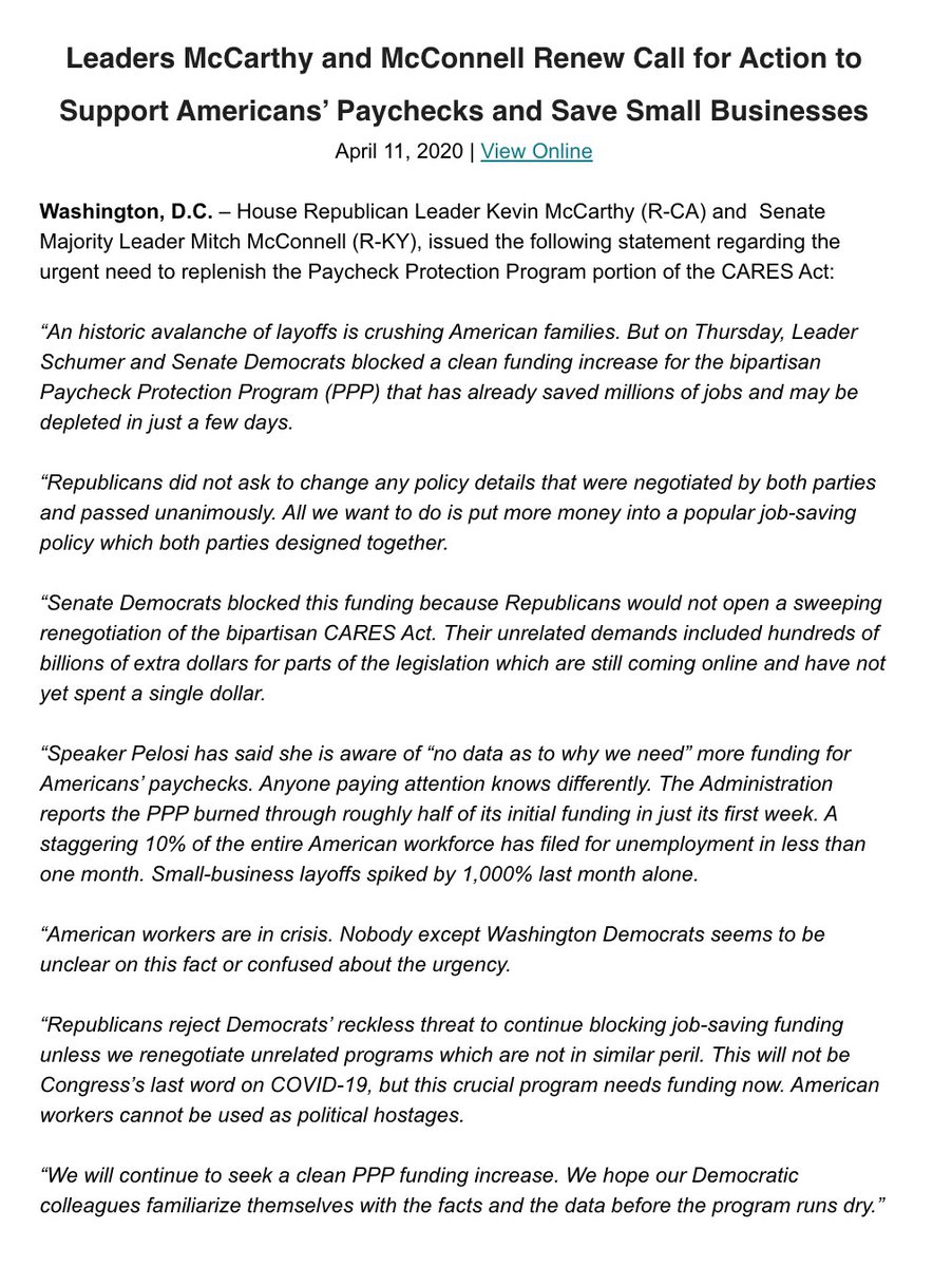Republicans will continue to seek a clean vote on funding for the job-saving Paycheck Protection Program. pic.twitter.com/Iu2gGNBtOG