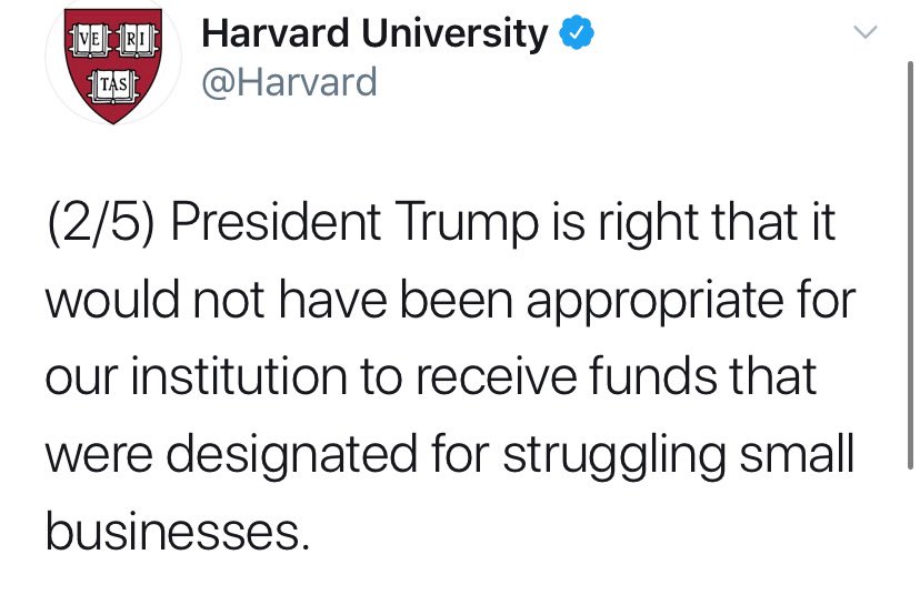 Harvard University says President @realDonaldTrump is RIGHT that it would not have been appropriate for them to receive funds meant for struggling small businesses! pic.twitter.com/bQS1TqoCJL